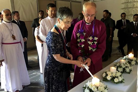 The Archbishop of Canterbury knelt in respect at the spot where a bomber detonated explosives at St Sebastian’s church in Sri Lanka.