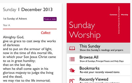 Sunday Worship (a new app for iPad/iPhone) presents the full Bible readings for the main Sunday service, together with the Collect & post Communion prayers for the week in a simple and elegant way, using the award-winning Common Worship design.