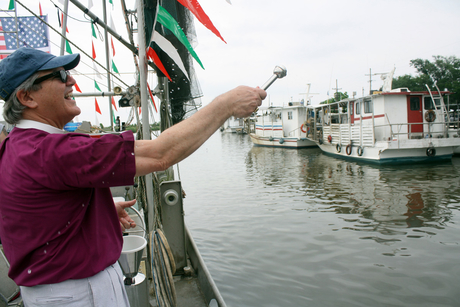 At precisely one o’clock in the afternoon, the bell in front of St. Andrew’s was rung to call people to the bayou. The Rt. Rev. Morris K. Thompson Jr., Bishop of Louisiana, offered prayers for the fisherman, the boats, and the community. He then boarded the Brother’s Pride shrimp boat captained by Charles Lovell Jr.